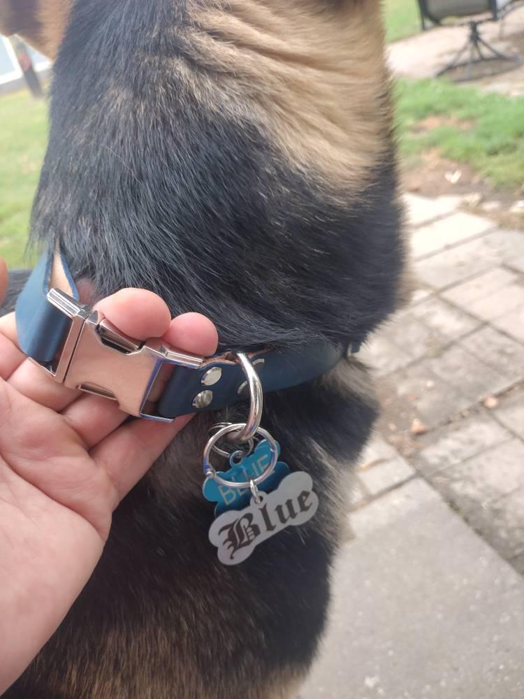 Spoil your furry friend with a personalized touch with our soft and durable leather collar. Featuring an engraved metal buckle and brass pet name tag, this collar is the perfect gift for dog lovers. Customized with your pet's name, this collar adds a special touch to their everyday wear, making them the most stylish pup on the block. Handcrafted with love and attention to detail, this collar is both practical and stylish, ensuring your pet looks and feels their best wherever they go. Treat your beloved pup to something special with this personalized leather collar.