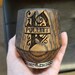 Handcrafted charred oak whiskey glass with deep wood engraving – rustic style tumbler for bourbon lovers.
